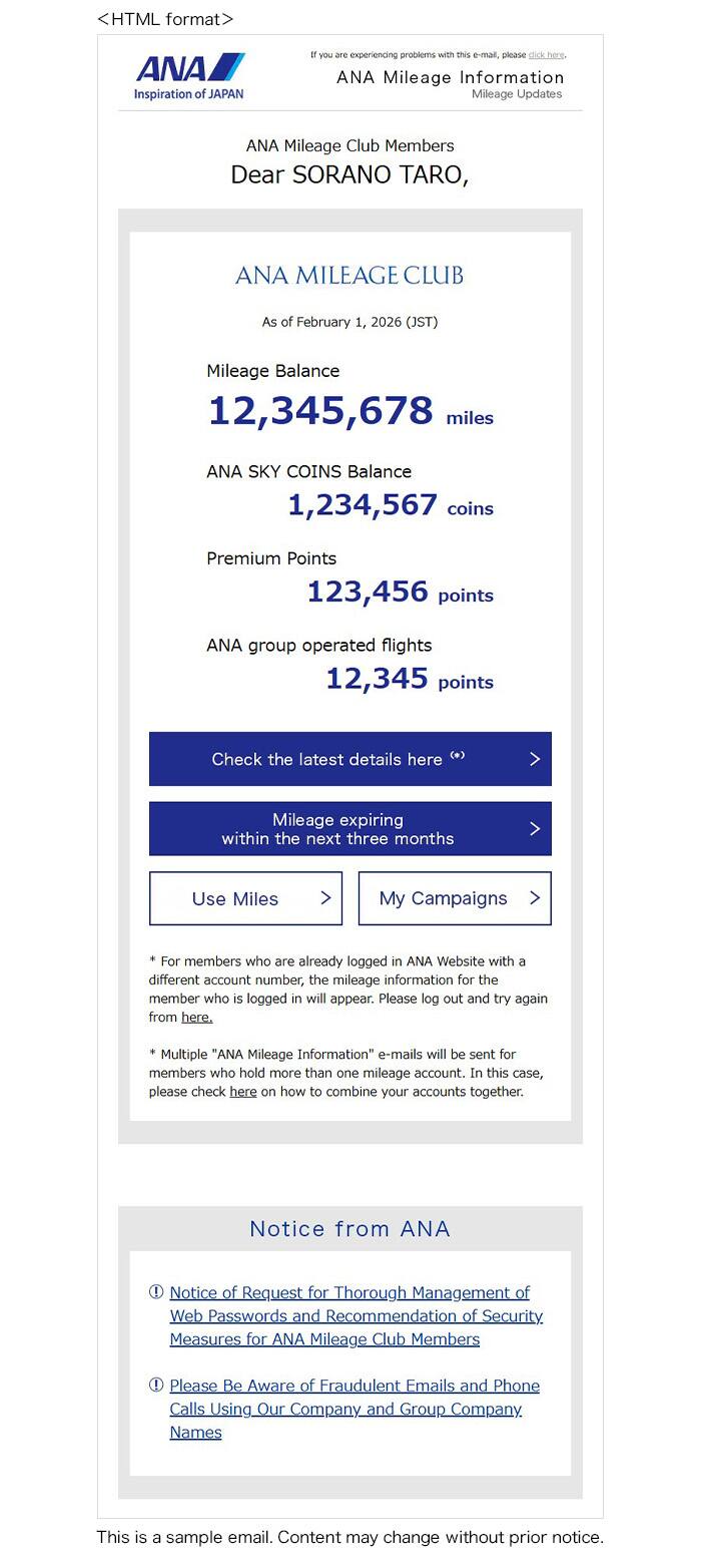 Statements (Mileage Balance, ANA SKY COIN Balance) will be sent each month by e-mail to all customers.