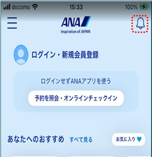 ANAアプリ内のお知らせアイコンを選択